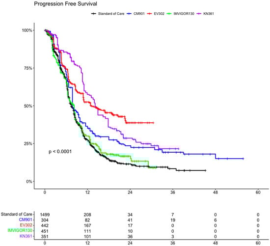 In the PFS analysis, we included 3047 patients from four clinical trials (1547 patients in the experimental arms and 1500 in the control arms). In the ITT population, all the experimental arms showed an advantage compared with the standard of care arm (including the individual patient data of PFS from all the control arms of the clinical trials) (Figure 6 and Figure S1). This advantage was statistically significant for KEYNOTE-361 (HR 0.47 CI 95% 0.40–0.56, p < 0.001), EV302 (HR 0.49 CI 95% 0.42–0.57, p < 0.001), and CheckMate-901 (HR 0.73 CI 95% 0.62–0.85, p < 0.001), while there was no statistically significant advantage for IMVIGOR130 (HR 0.95 CI 0.84–1.08, p = 0.47).