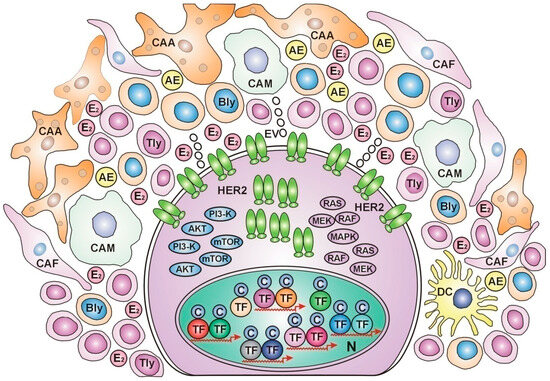 HER2-overexpressed, immune-hot breast cancer cell In the nucleus, numerous transcriptional factors (TFs) and their cofactors (Cs) work on the expression of various genes without estrogen regulation. Estrogen receptors are undetectable. In the cytoplasm, intensive protein synthesis produces HER2 and the members of its kinase cascades: PI3-K, AKT, mTOR, RAS, RAF, MEK, and MAPK, for rectifying cell proliferation via unliganded ER activation. At the cell membrane, numerous HER2 receptors wait to find ERs appropriate for activation and improving genomic damages. In the peritumoral ring, cancer-associated adipocytes (CAAs), cancer-associated fibroblasts (CAFs), and dense immune cell infiltration help in the genomic repair and apoptosis of tumor cells. The cytokine secretome promotes aromatase enzyme (AE) expression and estradiol (E2) synthesis. CAM: cancer-associated monocyte, Bly: b lymphocyte, TLy: t lymphocyte, DC: dendritic cell, EV: extracellular vesicle, N: nucleus.