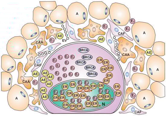 ER-positive, immune-cold breast cancer cell. The nucleus is crowded with estrogen (E2)-activated estrogen receptors (ERs), showing busy transcriptional activity. In the cytoplasm, intensive protein synthesis produces the players in the genome stabilizer circuit: estrogen receptors (ERs), BRCA proteins, and aromatase enzyme (AE), completed with estrogen (E2) synthesis. In the peritumoral ring, lipid-laden adipocytes (As) border the actively helping cells, cancer-associated adipocytes (CAAs), and cancer-associated fibroblasts (CAFs). The cytokine secretome activates aromatase enzyme synthesis.