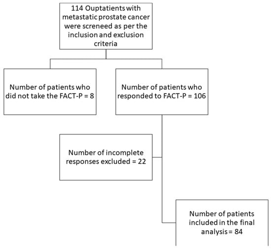 This study was planned as a pilot study with a sample size of convenience screening and recruiting consecutive patients over 18 years of age with a histologically confirmed diagnosis of primary metastatic prostate cancer who were receiving systemic treatment at our center for a predetermined duration between September 2021 and June 2022. Patients with an expected life expectancy of <12 weeks, as determined by the treating oncologist, were excluded. All patients in this study had de novo metastatic prostate cancer, and none of them had been treated for local disease in the past (Figure 1). Demographic data were collected from all the participants, which included age, urban or rural residence (as reported by the patients), education status (categorized as illiterate—someone who cannot read and write []; the ones who were literate were categorized into those who have completed primary, middle, or high school or those who have a graduation or post-graduation degree), presence of comorbidities (comorbidities expected to be in a frequency of greater than 1% in our patient population were pre-specified and included in the case record form—diabetes mellitus, hypertension, hypothyroidism, CAD, CKD, stroke, and TIAs; the rest were classified as others), addictions, and accessibility to the hospital (calculated by measuring the distance from the patient’s PIN code to the PIN code of the hospital using Google Maps, 2021).