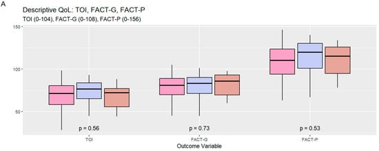 Descriptive statistics were used to present demographics and baseline clinical parameters. Categorical data were described as percentages, and continuous variables were described as mean (± standard deviation). The means of the FACT-P, FACT-P TOI, and FACT-G scores were calculated as the composite scores and domain-wise subscores of the FACT-P tool and demonstrated as box and whiskers plots. Potential predictive factors associated with better or worse FACT-P TOI, FACT-P, and FACT-G scores were identified using linear regression analysis. Univariable linear regression analysis was performed on all the baseline demographic and clinical factors reported with the linear regression coefficient, beta, and its 95% confidence interval. Those with a p-value of <0.05 or previously studied prognostic factors were included in the multivariable analysis. The significant p-value used was specified as <0.05 a priori. Statistical analysis was performed using R version 4.3.2 (RStudio, R Foundation for Statistical Computing, Vienna, Austria).