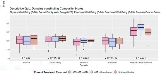 The following supporting information can be downloaded at: https://www.mdpi.com/article/10.3390/curroncol31090366/s1, Figure S1: Domain-wise scores constituting FACT-P compared with United States population reference values.; Table S1: Domain-wise univariable regression analysis; Table S2: Domain-wise multivariable regression analysis.