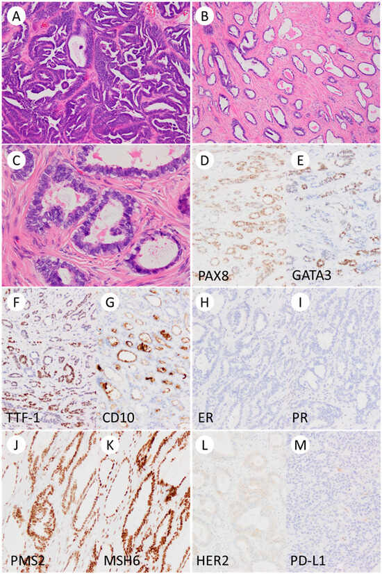 Morphological and immunohistochemical findings of a mesonephric-like adenocarcinoma of the ovary. The tumor shows various histological patterns, including glandular and papillary patterns ((A), ×100) and tubular structures containing eosinophilic material in the hyalinized stroma ((B), ×100). The tumor cells are cuboidal to cylindrical with enlarged nuclei ((C), ×100). Immunohistochemically, the tumor cells are positive for PAX8, GATA3 (focal), TTF1 (focal), and CD10 (luminal) but negative for estrogen receptor and progesterone receptor ((D–I), ×200). In addition, the tumor cells show intact expression of PMS2 and MSH6 ((J,K), ×200), are weakly positive for HER2 (focal; score 1+, ×200) (L), and are PD-L1 negative (combined positive score < 1) ((M), ×200).