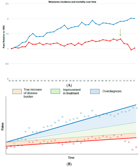 The epidemiological signature of overdiagnosis is an increase in the incidence of disease in spite of stable mortality [21], where the latter is viewed as a marker for stable true cancer occurrence. As an example, let us consider the incidence and mortality for melanoma in Australia using a national cancer registry [22]. Trends were illustrated using the relative age-adjusted rates over time, in which the 1982 rate serves as the baseline (Figure 1). Compared with the baseline (year 1982), incidence doubled, whereas mortality increased by approximately 30% over 30 years, with a peak in 2013. From 2014, there was a sharp reduction of deaths (−38% within 3 years), likely due to the efficacy of novel treatments such as checkpoint inhibitors, whereas the age-standardised incidence rate continued to rise (Figure 1). While it is conceivable that the observed mortality could be the result of a simultaneous rise in true cancer incidence and advancements in treatment over time, such a perfect annual balance of these opposing factors would be an extraordinary—and unlikely—coincidence [21]. In this specific example, there might have been a true increase in disease burden in Australia, since mortality rates also increased. Even assuming that improvements in medical care were responsible for reducing melanoma mortality by a certain extent [23], there would still be a large divergence between diagnoses and deaths (Figure 1B). Furthermore, when novel, effective treatments such as immunotherapy break though, this generally leads to a sharp decrease in case fatalities within a short timeframe. Accordingly, the introduction of an effective therapy in Australia could be inferred from mortality trends as a reduction of mortality (Figure 1A, arrow), likely due to a reduction in melanoma case fatalities, which can be observed post 2013. Thus, the trends shown in Figure 1 strongly suggest that overdiagnosis is responsible, at least in part, for the increase in melanoma diagnoses in Australia.