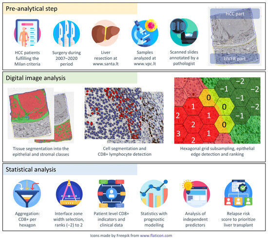 Study workflow. Pre-analytical step: HCC patients meeting the Milan criteria underwent liver resection between 2007–2020. Samples were analyzed and scanned slides were annotated by a pathologist. Digital image analysis: tissue samples were segmented into epithelial and stromal classes, and CD8+ lymphocytes were detected using HALO®AI (Indica Labs, USA). Hexagonal grid subsampling was applied for epithelial edge detection. Statistical analysis: aggregated CD8+ data per hexagon were combined with clinical data for prognostic modeling. Independent predictors were analyzed, and a relapse risk score was developed to prioritize liver transplant candidates.