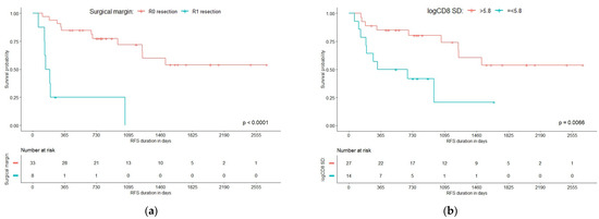Panel (a) of Figure 2 displays the survival probabilities over time for patients categorized by their resection status: R0 (complete resection) and R1 (incomplete resection). The p-value for the comparison between R0 and R1 groups is very low (p < 0.0001), indicating that patients with complete resection (R0) have a longer RFS compared to those with incomplete resection (R1). Panel (b) of Figure 2 illustrates the RFS probabilities for patients based on the SD of CD8 density at the tumor edge, with groups divided into low (<5.8) = 1 and high (>5.8) = 0. The p-value for this comparison is 0.0066, indicating a statistically significant difference between the two groups and implying that a low SD of CD8+ density along the tumor edge has a negative impact on RFS.