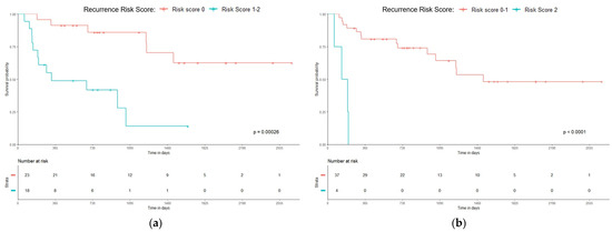 HCC Recurrence Risk Score: (a) 0 vs. 1–2 (p = 0.00026) and (b) 0–1 vs. 2 (p < 0.0001).