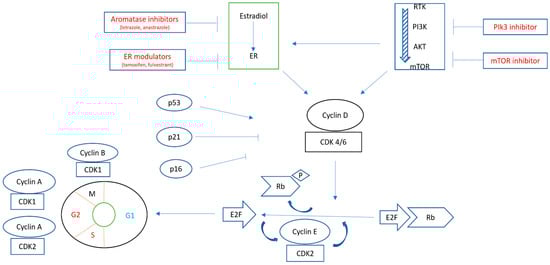 Schematic presentation of the interaction between estrogen receptor (ER) and the PI3K/AKT/mTOR pathway. They converge on activating CDK4/6, leading to phosphorylation of Rb and releasing E2F, which, in turn, allows the progression of the cell cycle from the G1 to the S phase. Multiple therapeutic agents can be used to block the steps of such pathways [17,18].
