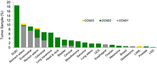 Genomic aberrations that activate D-type cyclins are associated with enhanced sensitivity to the CDK4 and CDK6 inhibitor (abemaciclib) [19]. Frequency of 30 UTR loss in the mRNA for CCND1, -2, or -3 across TCGA tumor samples. Abbreviations: CDK, cyclin-dependent kinase; TCGA, The Cancer Genome Atlas; LAML, acute myeloid leukemia; LGG, lower-grade glioma; UCS, uterine carcinosarcoma.