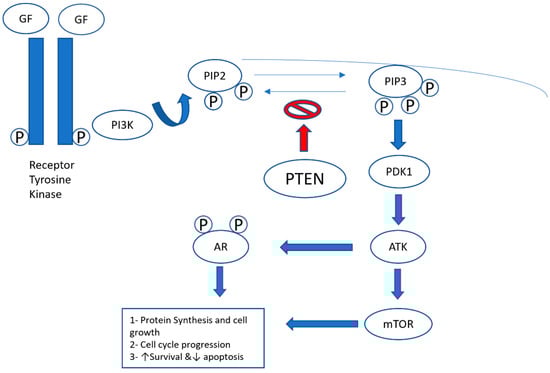 PI3K (phosphatidylinositide 3-kinases)/PTEN (phosphatase and tensin homolog gene)/Akt pathway. The binding of growth factors (GFs) to the receptor tyrosine kinase activates the receptor complex, which, in turn, recruits and activates PI3K. The activated PI3K converts PIP2 (phosphatidylinositol-4,5-diphosphate) to PIP3 (phosphatidylinositol-3,4,5-triphosphate), which subsequently mediates the phosphorylation of Akt through PDK1 (protein kinase 1). Phosphorylated Akt is active on a wide range of substrates, but one of its most important targets is mTOR, which is involved in cell growth, proliferation, and survival. Activated Akt (protein kinase B) also interacts with the androgen receptor (AR) in an androgen-independent manner, leading to overactivation of the AR signaling pathway in castration-resistant prostate cancer. PTEN is a tumor suppressor that negatively regulates the pathway by removing the 3-phosphate from PIP3, converting it back to PIP2. Loss of PTEN leads to overactivation of Akt, which, in turn, is associated with uncontrolled cell proliferation, decreased apoptosis, and enhanced tumor angiogenesis [22].