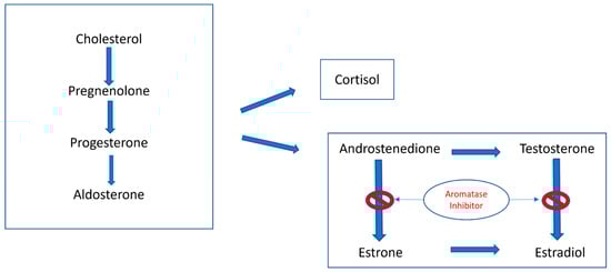 Schematic presentation of steroidogenesis showing the role of aromatase inhibitors in blocking the conversion of androstenedione and testosterone to estrone and estradiol, respectively. There are different types of aromatase inhibitors: Type I steroidal drugs bind competitively but irreversibly to the enzyme, while Type II non-steroidal inhibitors, such as anastrozole and letrozole, bind reversibly to the enzyme and fit into the substrate binding site [27].