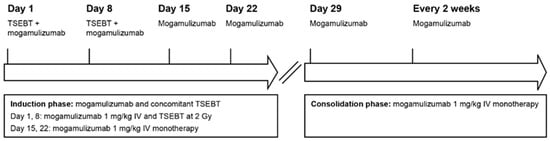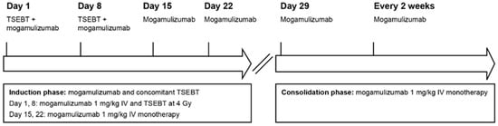Currently, two phase II single-arm clinical trials, (1) a multicenter study led by the European Organisation for Research and Treatment of Cancer Cutaneous Lymphoma Task Force (EORTC-CLTG; NCT04128072 []) and (2) a single-center study (Stanford, NCT04256018 []), are investigating the combination of mogamulizumab and TSEBT in MF/SS (Table 2). The aim of these trials is to evaluate whether the combination of mogamulizumab and TSEBT has a manageable toxicity profile while controlling the disease burden []. The regimens for the EORTC-CTCL study are the standard dosage of mogamulizumab (1 mg/kg IV weekly on days 1, 8, 15, 22, and 29 and then every 2 weeks) for two cycles but with sequential rather than concurrent TSEBT (12 Gy) in eight fractions (four fractions per week), administered after completing mogamulizumab []. Conversely, the design of the single-center study from Stanford includes an initial treatment with low-dose TSEBT (12 Gy) over 2–3 weeks followed by the mogamulizumab treatment in the standard dose [].