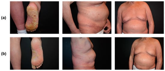 Patient 2 with Sézary syndrome (a) before and (b) after 11 administrations of mogamulizumab and 2 concurrent administrations of TSEBT at 4 Gy weekly.