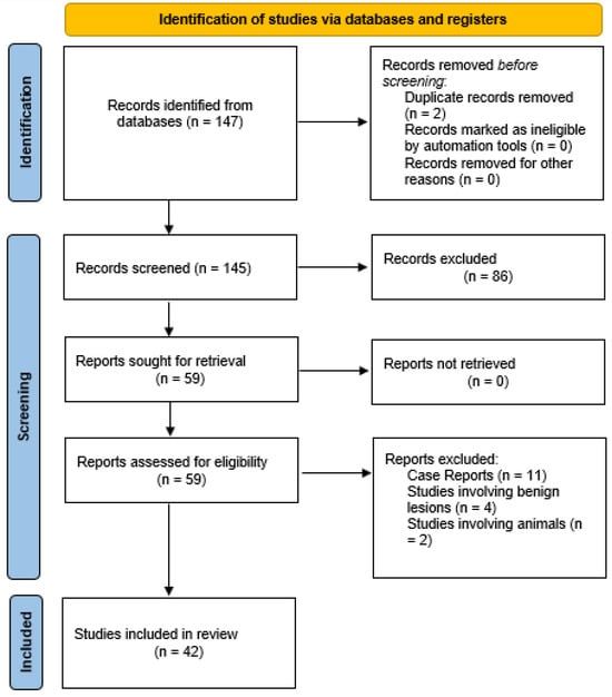 Out of 147 results, 42 articles met the inclusion criteria, while 105 were excluded. Among the excluded articles, 37 were reviews, 1 was a book, 1 was a duplicate article in Spanish, 11 were case reports, 1 was a letter to the editor, 4 articles addressed benign lesions, and 2 articles involved animal studies (the flow diagram for the selection of the studies included is summarized in Figure 1).