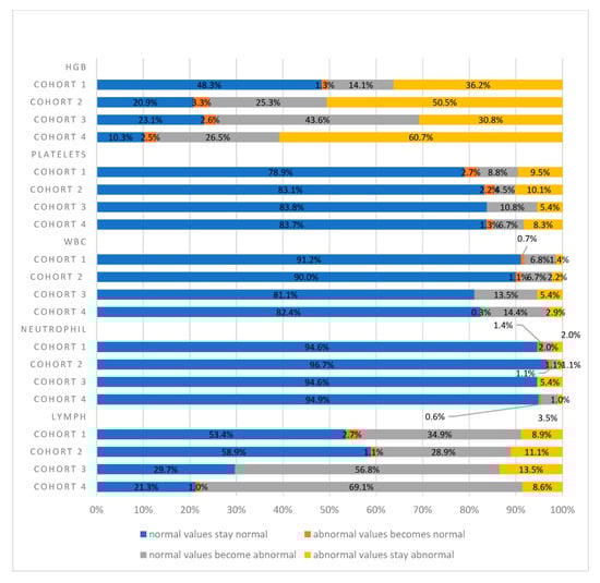 Significant differences in hemoglobin (HGB) values were identified among all four cohorts at baseline (p < 0.05), as highlighted in Table 2. However, no other statistically significant differences were found at baseline for any other hematologic parameters across all cohorts. A decrease in HGB was consistently observed at various time points, reaching the mRT-pRT stages, with odds ratios (ORs) of 6.71 (CI 2.84–15.83), 5.11 (CI 1.94–13.44), and 9.52 (CI 4.7–19.04) for Cohorts 2, 3, and 4, respectively (Figure 1). Cohort 4 exhibited an increased likelihood of suffering from decreased HGB, with a 26.5% drop in values on average, and persisting in 60% of the cohort at every time point throughout the treatment course. In Cohort 3 (PRT + PNRT), there was a 43.6% probability of patients with initially normal HGB values transitioning to abnormally lower levels during the course of therapy, with 30.8% maintaining such levels thereafter. Notably, the likelihood of such transitions from normal to abnormal HGB values in Cohort 3 was lower compared to Cohorts 4 and 1, as illustrated in Figure 1.
