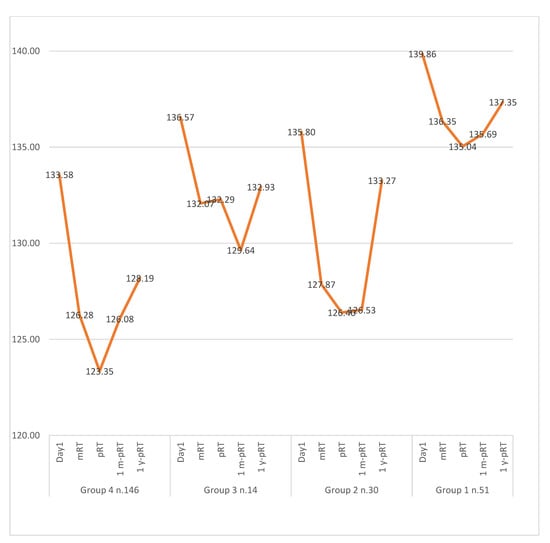 Furthermore, HGB values decreased in all cohorts, with odds ratios (ORs) of 8.80 (CI 3.36–23.03), 5.15 (CI 1.8–13.67), and 12.20 (CI 5.95–25.01) for Cohorts 2, 3, and 4, respectively. HGB values for Cohort 4 decreased the most at the pRT time point (p < 0.02). The ORs for decreased HGB at 1M-pRT were 4.08 (CI 1.87–8.91), 6.7 (CI 2.6–17.2), and 9.1 (CI 4.8–17.1) for Cohorts 2, 3, and 4, respectively. At 1Y-pRT, The HGB for all cohorts approached baseline without any significant differences, except for Cohort 4, where a residual OR of 2.84 (CI 1.14–7.08) persisted.