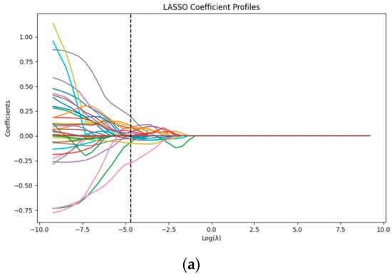 From each ROI in the training set, we extracted 1374 ultrasound imaging omics features. Initially, we excluded 42 features that were constant or lacked statistical significance. Next, we excluded 575 features with correlations higher than 0.95 to reduce redundancy. Further, using Spearman correlation analysis, we identified 36 features with relatively high correlations (greater than 0.45) with the target variable (benign/malignant). Finally, through LASSO selection, we identified nine optimal features. The feature selection and parameter-tuning process of the LASSO algorithm are shown in Figure 3a,b, and a horizontal bar chart displaying the importance of these optimal features is shown in Figure 3c.