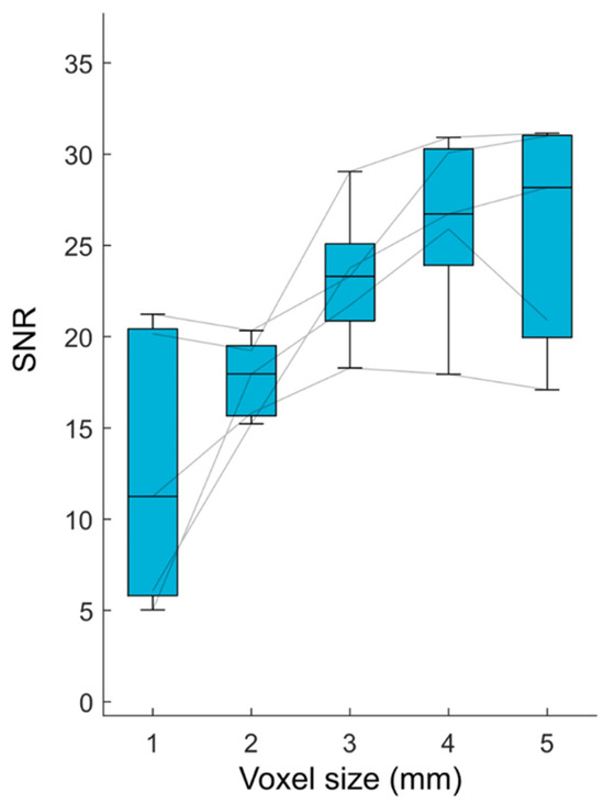 Analysis of best tradeoff between signal-to-noise ratio (SNR) and resolution. Visually, a relative plateau is recognizable between 3 and 5 mm voxel slice thicknesses. Therefore, a voxel slice thickness of 3 mm was considered as the best ratio of the lowest SNR on the plateau.
