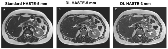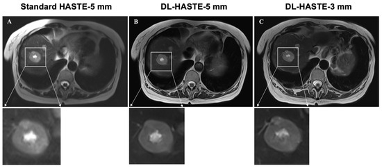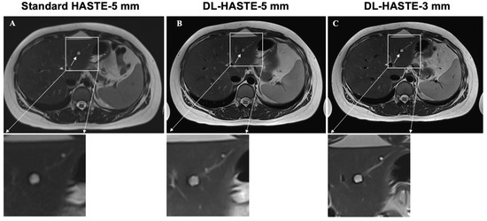 Delineation of solid liver lesion on clinical standard-HASTE-5 mm (A), DL-HASTE-5 mm (B), and DL-HASTE-3 mm (C). Lesion delineation was rated higher for DL-HASTE ((B,C), excellent image quality) compared with HASTE ((A), good image quality).