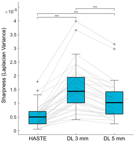 Quantitative analysis revealed higher sharpness for DL-HASTE-3 mm (1.56 × 10−5 ± 8.69 × 10−6) compared with DL-HASTE-5 mm (1.10 × 10−5 ± 6.93 × 10−6, ***: p < 0.001) and standard-HASTE-5 mm (5.59 × 10−6 ± 4.12 × 10−6, p < 0.001). Sharpness of DL-HASTE-5 mm was again higher than that of standard-HASTE-5 mm (p < 0.001).