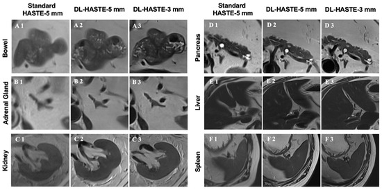 Sharpness of abdominal organ margins was compared between standard-HASTE-5 mm (A1,B1,C1,D1,E1,F1), DL-HASTE-5 mm (A2,B2,C2,D2,E2,F2), and DL-HASTE-3 mm (A3,B3,C3,D3,E3,F3). Note the improved sharpness of the bowel and adrenal gland on DL-HASTE-3 mm compared with DL-HASTE-5 mm (A3 vs. A2, B3 vs. B2). DL-HASTE occasionally showed tiny zebra-striped artifacts that did not interfere with the diagnostic image quality (B2,D2,D3).