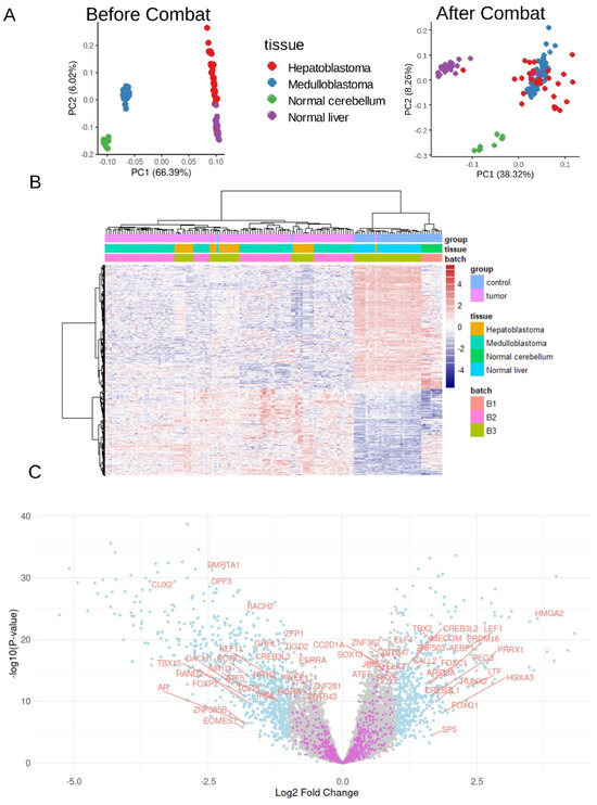 To conduct this analysis, we assembled data from the GSE37418 (medulloblastoma), GSE44971 (cerebellum control), and GSE104766 (normal liver and hepatoblastoma) datasets, normalizing them in a common matrix using the Combat algorithm to adjust for batch effects (Supplemental Figure S2a). The heterogeneity in Combat density plots across samples (Supplemental Figure S2b) was reduced by applying quantile post-Combat normalization (Supplemental Figure S2c). Unsupervised principal component analysis (PCA) of the fully normalized transcriptome data confirmed that samples from different batches were well integrated (Supplemental Figure S3A and Figure 1A). Additionally, this analysis clearly distinguished tumor samples (medulloblastoma and hepatoblastoma) from normal controls (cerebellum and liver) (Supplemental Figure S3B), suggesting a shared transcriptional expression signature between these tumors.