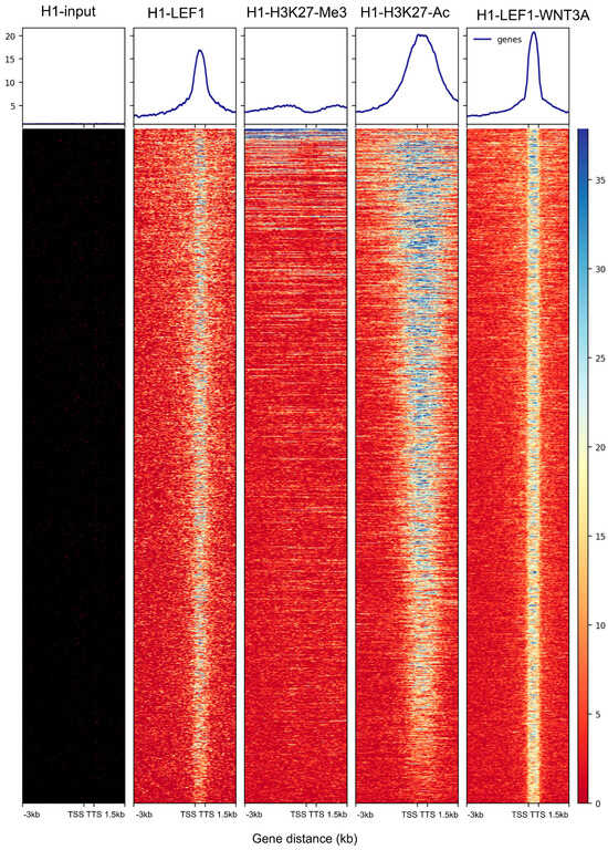 Embryonic program of LEF1 genome binding occupancy after WNT3A stimulation: genomic heatmap illustrating the enrichment of genomic intervals (hg38) for LEF1 binding in H1 human embryonic stem cell chromatin after WNT3A stimulation. From left to right, respective enrichment was shown for ChIP-seq of H1 input chromatin, LEF1 in unstimulated H1 cells, H3 histone lysine 27 trimethylation (repressive mark), H3 histone lysine 27 acetylation (active mark), and LEF1 in WNT3A-stimulated H1 cells. (TSS: transcription start site and TTS: transcription termination site).