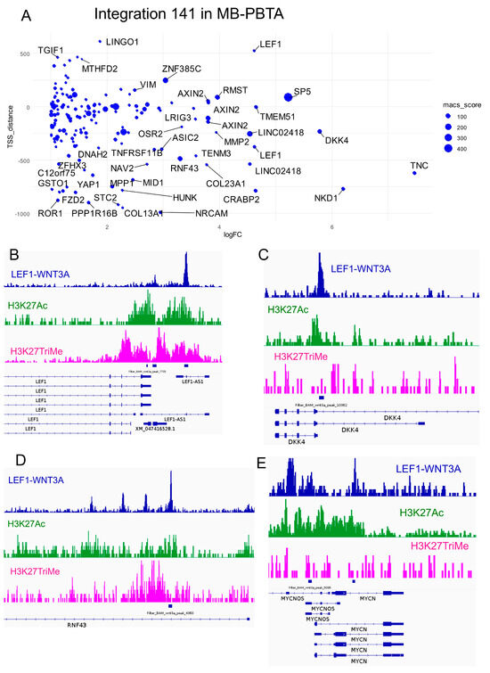 Heterogeneity of LEF1-dependent embryonic promoters for targets activated during WNT medulloblastoma: integration into the MB-PBTA cohort. (A) Scatterplot of the integrative analysis representing ChIP-seq peak distances from TSS versus log2 fold changes in the WNT-MB transcriptome. Dot sizes represent peak scores from the MACS2 algorithm for LEF1-H1-WNT3A ChIP-seq data. (B) Promoter visualization for the LEF1 and LEF1-AS loci. (C) Promoter visualization for the DKK4 locus. (D) Promoter visualization for the RNF43 locus. (E) Promoter visualization for the MYCN locus.