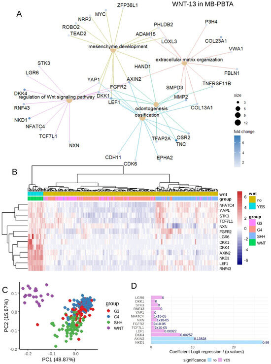 WNT signaling LEF1-dependent signature in medulloblastoma: MB-PBTA cohort. (A) Functional enrichment network based on LEF1 targets activated during the WNT-medulloblastoma subtype using the Gene Ontology Biological Process (GO-BP) database. (B) Unsupervised clustering (Euclidean distances) of the WNT-program LEF1-dependent genes in medulloblastoma tumors. (C) Principal component analysis (PCA) of the WNT-program LEF1-dependent genes in medulloblastoma tumors. (D) Univariate binomial regression analysis of the 13 WNT signaling target genes of LEF1 during medulloblastoma (outcome: WNT subtype).