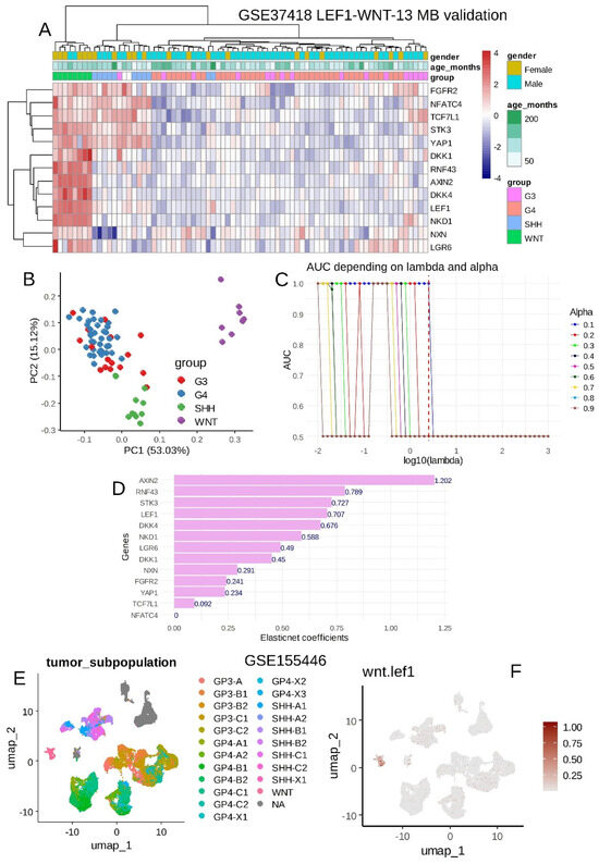 Validation of the WNT-LEF1 signature in independent medulloblastoma cohorts: GSE37418 and scRNA-seq GSE155446 datasets. (A) Unsupervised clustering (Euclidean distances) based on the expression of the WNT-LEF1-dependent program (GSE37418). (B) Principal component analysis (PCA) of the WNT-LEF1-dependent program (GSE37418). (C) ElasticNet tuning of lambda and alpha parameters to predict the WNT subgroup using the WNT-LEF1-dependent program. (D) Barplot of ElasticNet coefficients predicting the WNT subtype in the GSE37418 cohort. (E) WNT-MB subtypes in the single-cell transcriptome dataset GSE155446 (28 MB tumor samples). (F) WNT-LEF1-dependent score in the single-cell RNA-seq dataset GSE155446.