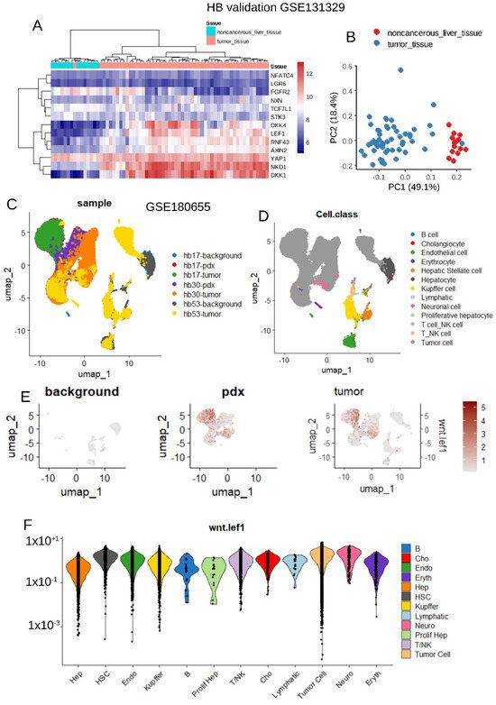 Validation of the WNT-LEF1 signature in an independent hepatoblastoma cohort: GSE131329 and scRNA-seq GSE180655 datasets. (A) Unsupervised clustering (Euclidean distances) based on the expression of the WNT-LEF1 program (GSE131329). (B) Principal component analysis (PCA) of the WNT-LEF1 program (GSE131329). (C) UMAP dimensionality reduction showing sample identities in the scRNA-seq dataset GSE180655. (D) UMAP dimensionality reduction showing cell-type identities in the scRNA-seq dataset GSE180655. (E) WNT-LEF1-dependent score in the single-cell RNA-seq dataset GSE180655, stratified by sample types (background: adjacent normal liver; pdx: patient-derived xenotransplantation model; tumor: HB tumor samples). (F) WNT-LEF1-dependent score in the single-cell RNA-seq dataset GSE180655, stratified by cell types.