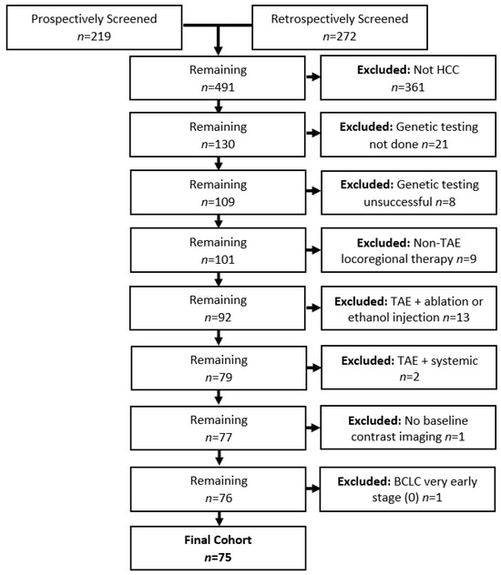 All patients had a tissue diagnosis of HCC. Exclusion criteria included a lack of tumoral genetic analysis, non-TAE locoregional therapy, the combination of TAE with another locoregional therapy (e.g., ablation), the combination of TAE with concurrent systemic therapy, a lack of baseline contrast-enhanced imaging, and Barcelona Clinic Liver Cancer (BCLC) stage 0 or D disease.