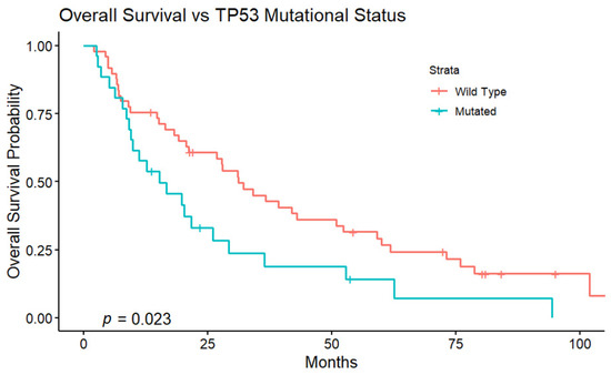 The median OS for all patients was 26.1 months (95% CI, 18.3–36.4). Patients with TP53-mutant tumors had a significantly worse median OS of 15.2 months (95% CI, 9.5–29.3), versus 31.2 months (95% CI, 21.2–52.4) (p = 0.023) for patients with TP53 wild-type tumors (Figure 2).