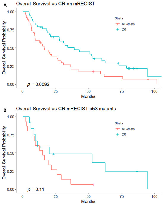 (A). For the entire cohort, patients who exhibited a CR had a significantly longer OS. (B). For the subset of patients with TP53-mutant tumors, a CR was not associated with a significantly longer OS.