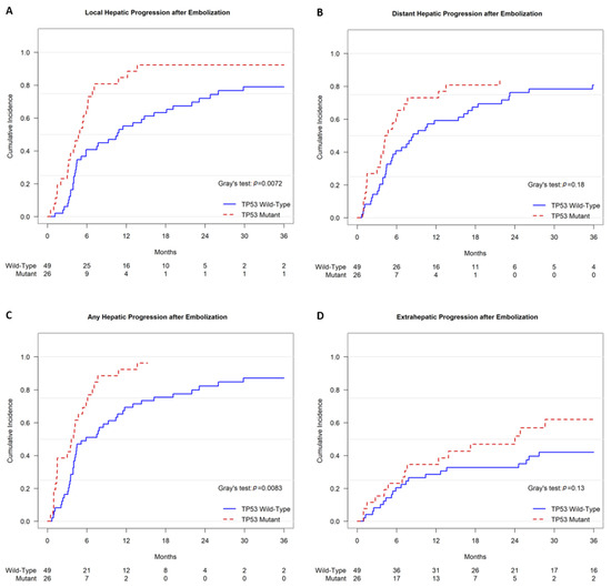 Cumulative incidence functions of progression after TAE. Patients with TP53-mutant HCC had significantly shorter times to local hepatic progression (A) and any hepatic progression (C) after TAE. There was no significant association between TP53 status and time to distant hepatic progression (B) or extrahepatic progression (D).