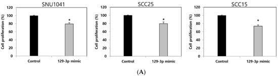 In the present study, the role of miR-129-3p in tumor progression was investigated using miR-129-3p mimic to overexpress the endogenous expression of miR-129-3p in SNU1041, SCC25, and SCC15 human HNSCC cells. In the cell proliferation assay, the miR-129-3p mimic-transfected HNSCC cells significantly suppressed the proliferation of the SNU1041, SCC25, and SCC15 cells compared with the control cells (p < 0.05; Figure 1A). In the cell invasion assay, the invasion of miR-129-3p mimic-transfected HNSCC cells was significantly inhibited in all three cell lines (p < 0.05; Figure 1B).
