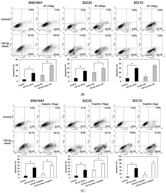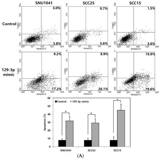 An Annexin-V apoptosis assay was used to evaluate the effect of miR-129-3p on apoptosis. Flow cytometry revealed that the miR-129-3p overexpression significantly increased the proportion of apoptotic cells in the SNU1041, SCC25, and SCC15 human HNSCC cells (p < 0.05; Figure 2A).