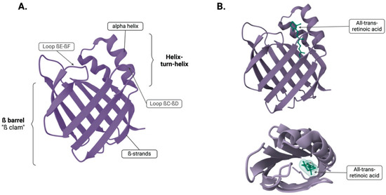 The ligand binding site, known as the ligand portal region, is composed of the helix–turn–helix motif and loops between βC-to-βD and βE-to-βF [16]. This region occupies a space of 400–600 A, which represents 5–10% of the protein’s total volume and it is two to three times larger than needed to hold its ligand. This region serves as a ligand portal because structural exposure, mobility, protease sensitivity, and the impact of mutations in this area affects binding kinetics. Within the ligand-binding cavity, there are ten conserved water molecules that form part of the ligand contact side. Ligands are stabilised within the amino acid sidechain that line the binding cavity by ionic interactions, hydrogen bonding networks with water, and interactions with hydrophobic regions. These findings have been shown by crystallographic and nuclear magnetic resonance (NMR) studies of iLBPs [4,5,15]. Figure 1 depicts the binding of the ligand, all-trans-retinoic acid (atRA) in the binding site of cellular retinoic acid binding protein 2 (CRABP2).