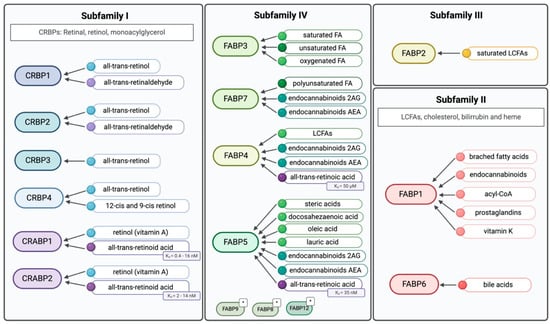 FABP1 and FABP6 (Subfamily II) have larger binding pockets, allowing them to accommodate larger ligands, such as bile acids, cholesterol, bilirubin and heme, and thus, their role is predominantly in the gastro-intestinal tract and liver. Subfamily III consists solely of FABP2 that has a smaller, solvent accessible binding pocket, giving it a higher affinity for saturated long-chain fatty acids (LCFAs) [2,4]. The members of subfamily IV, which is the biggest among the iLBPs subfamilies, bind diverse lipids, as illustrated in Figure 2.