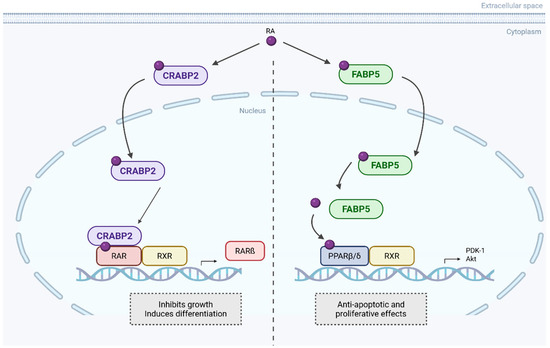 CRABP2 and FABP5 opposite pathways upon RA binding. RA is transported to the nucleus by CRABP2 and binds to retinoic acid receptor α (RARα), forming heterodimers. This classical RA pathway leads to gene expression that inhibits cell growth. Alternatively, RA can be transported by FABP5 to non-classical receptors, such as PPARβ/δ, activating non-genomic pathways that promote cell proliferation and inhibit apoptosis. Created in BioRender. Kakouratos, C. (2025) https://BioRender.com/qxxrpl6. Adapted from Gupta et al. [63].