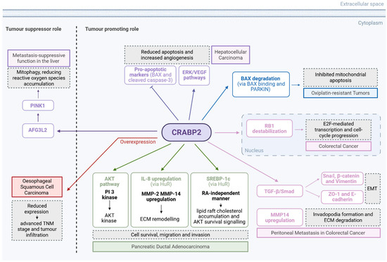 The role of CRABP2 as tumour suppressor and tumour promoter via different pathways in GI cancers. Created in BioRender. Kakouratos, C. (2025) https://BioRender.com/471o42b.