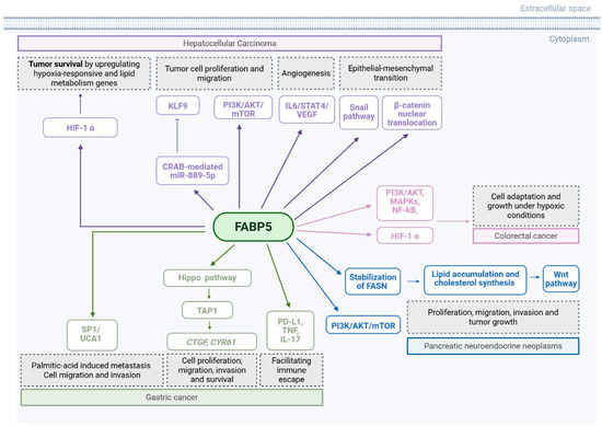 In HCC, FABP1 was shown to be a pro-tumourigenic factor that enhances angiogenesis and metastatic potential in HCC through upregulation of VEGF-A and its expression is significantly elevated in HCC tissues compared to adjacent normal tissues, with a strong positive correlation to VEGF-A levels. It was shown that FABP1 promotes VEGF-A expression via both direct transcriptional activation—mediated by the Akt/mTOR (mammalian Target of Rapamycin) in a Hypoxia Inducible Factor (HIF1a)-dependent way—and through interaction with VEGFR2 in cholesterol-rich membrane microdomains, activating downstream signalling pathways involving Src, Focal Adhesion Kinase (FAK), and cell division control protein 42 homolog (cdc42) that facilitate cell migration and neovascularisation. In vivo, FABP1 overexpression increased tumour growth, angiogenesis, and lung metastases in murine models, establishing its role as a promoter of tumour progression in HCC cells with high endogenous VEGF-A expression [79].