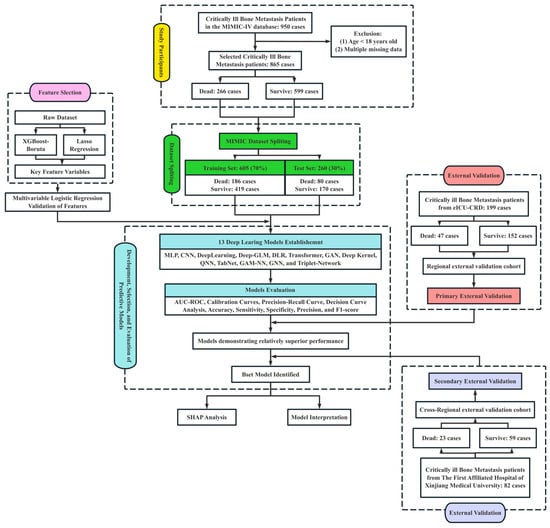 Study flowchart illustrating feature selection, model development, evaluation, and external validation processes. A total of 950 critically ill bone metastasis patients were initially identified from the MIMIC-IV database. After excluding patients aged under 18 years and those with multiple missing data points, 865 cases were included, comprising 266 deaths and 599 survivors. The dataset was randomly split into a training cohort (n = 605, 70%) and a test cohort (n = 260, 30%). Feature selection was performed using XGBoost-Boruta and Lasso regression, followed by multivariable logistic regression validation. Thirteen DL models were established, including MLP, CNN, DeepLearning, Deep-GLM, DLR, Transformer, GAN, Deep Kernel, QNN, TabNet, GAM-NN, GNN, and Triplet-Network. Model performance was evaluated using AUC-ROC, calibration curves, precision-recall curves, decision curve analysis, sensitivity, specificity, precision, and F1-score. The best-performing model underwent further SHAP analysis for model interpretation. External validation was conducted using two independent cohorts: a regional validation cohort from the eICU-CRD (n = 199) and a cross-regional validation cohort from The First Affiliated Hospital of Xinjiang Medical University (n = 82).