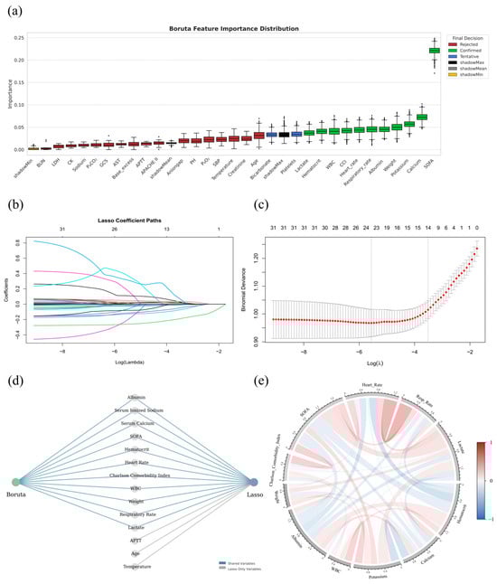 Feature selection and correlation analysis of key predictors associated with 30-day mortality in critically ill BBM patients. (a): Distribution of feature importance scores obtained from the Boruta algorithm based on the MIMIC-IV dataset. Features are categorized into Confirmed (green), Tentative (blue), and Rejected (red) according to their relevance, with shadow features (shadowMin, shadowMean, shadowMax) used as baseline references. (b): Coefficient trajectories for all variables across a series of penalization strengths (log-transformed λ values) in Lasso regression. Each line represents a variable, with non-zero coefficients progressively eliminated as the penalty increases. (c): Ten-fold cross-validation results for Lasso regression, showing the mean binomial deviance across a range of log(λ) values. The λ corresponding to the minimum deviance (λ_min) and the λ within one standard error of the minimum (λ_1SE) are indicated by vertical dashed lines. To optimize model simplicity and generalizability, λ_1SE was selected, resulting in the retention of 14 non-zero feature coefficients; (d): Integration of Boruta and Lasso feature selection outcomes. Variables selected by both methods are identified as shared features (blue lines), whereas features selected uniquely by Lasso are marked separately (gray lines); (e): Chord diagram depicting pairwise Pearson correlation coefficients among the selected key variables. The width and color of the chords represent the strength and direction of correlations, with red indicating positive associations and blue indicating negative associations.