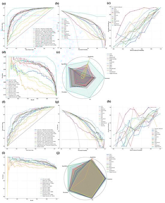 Comprehensive evaluation of 13 DL models for predicting 30-day mortality in critically ill BBM patients. (Train: (a), Test: (f)): ROC curves with AUC and 95% confidence intervals were plotted to assess model discrimination in the training and test sets; (Train: (b), Test: (g)): Decision curve analysis was conducted to evaluate clinical net benefit across a range of threshold probabilities; (Train: (c), Test: (h)): Calibration curves were generated to examine the agreement between predicted and observed risks; (Train: (d), Test: (i)): Precision-recall curves were used to assess performance under class imbalance; (Train: (e), Test: (j)): Radar plots summarizing normalized accuracy, sensitivity, specificity, precision, and F1-score were constructed to enable cross-model comparisons.
