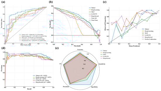 TabNet demonstrated the most robust external performance across all key domains, with an AUC of 0.840 and an AP of 0.932, reflecting only minor declines from its internal validation set values in MIMIC-IV (AUC 0.878 and AP 0.940). It also demonstrated the highest net clinical benefit across all threshold probabilities and maintained excellent calibration, with predicted risks closely aligned with observed outcomes. In addition, radar plots confirmed stable and balanced classification performance across accuracy, sensitivity, specificity, precision, and F1 score, supporting its suitability for high-risk clinical settings. By contrast, DeepLearning, GAM-NN, MLP, and Deep-Kernel showed notable reductions in discrimination and precision, accompanied by degraded calibration and limited clinical benefit, indicating insufficient generalizability and leading to their exclusion from further evaluation. Figure 4a–e illustrates external validation results in the eICU-CRD, including ROC curves (a), decision curves (b), calibration plots (c), precision-recall curves (d), and radar charts across key performance dimensions (e).