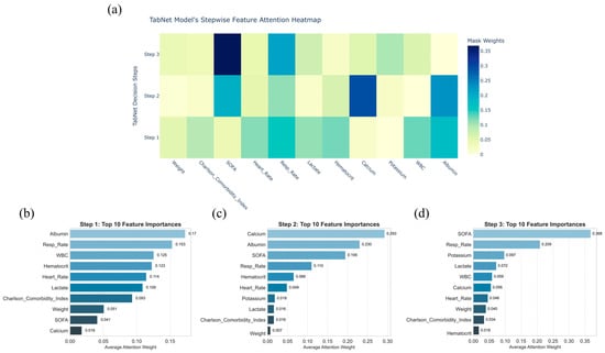 Stepwise feature attention analysis of the TabNet model for predicting critically ill bone metastasis patients’ 30-day mortality. (a): Heatmap showing the distribution of feature attention weights across decision steps 1 to 3; (b–d): bar plots displaying the top 10 features ranked by average attention weights at each corresponding decision step.