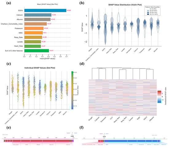To further dissect the predictive mechanism of TabNet, a multi-level SHAP (SHapley Additive exPlanations) analysis was performed, a game-theoretic approach that quantifies the contribution of each feature to model predictions while providing both global importance rankings and case-specific explanations. Mean absolute SHAP values ranked SOFA score, serum calcium, albumin, CCI, and serum potassium as the most influential features (Figure 6a). The associations between the five top SHAP-ranked variables (SOFA score, serum calcium, serum albumin, Charlson Comorbidity Index, and serum potassium) and mortality were assessed using the Mann–Whitney U test, point-biserial correlation, and Cliff’s δ, with violin plots depicting the distributions for the survival and death groups. All five variables showed statistically significant differences between groups, with effect sizes ranging from small (potassium, calcium) to large (SOFA score), indicating varying degrees of clinical relevance, with detailed results provided in Supplementary Material S3. Violin plots showed inter-individual variability, with wide SHAP distributions for weight, CCI, SOFA score, heart rate, and respiratory rate, reflecting heterogeneous impacts, whereas serum potassium and hematocrit showed more stable contributions (Figure 6b). Beeswarm plots revealed directional associations, with lower weight, elevated CCI, higher SOFA score, tachycardia, increased respiratory rate, elevated lactate, hypocalcemia, low hematocrit, and leukocytosis all linked to greater mortality risk, whereas higher albumin was protective (Figure 6c). SHAP heatmaps displayed the distribution of feature contributions across individuals, highlighting the discriminative value of weight, serum calcium, serum potassium, SOFA, and albumin (Figure 6d). Force plots from two representative cases (Death: Figure 6e, Survival: Figure 6f) further illustrate patient-specific decision pathways.