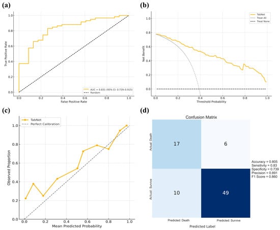 In the cross-region external validation cohort from the First Affiliated Hospital of Xinjiang Medical University, which included 59 patients who survived and 23 who died within 30 days, TabNet demonstrated consistent performance, with an AUC of 0.831 (95% CI: 0.729–0.915), indicating strong discriminative power (Figure 7a). Decision curve analysis revealed superior net clinical benefit across most thresholds compared with treat-all or treat-none strategies (Figure 7b), while calibration curves showed excellent agreement between predicted and observed risks (Figure 7c). The model achieved an accuracy of 80.5%, sensitivity of 83.0%, specificity of 73.9%, precision of 89.1%, and an F1 score of 86.0%, reflecting well-balanced classification (Figure 7d). These results support the Tabnet model’s generalizability and clinical applicability across geographically diverse populations. The clinical characteristics of critically ill BBM patients in the First Affiliated Hospital of Xinjiang Medical University cohort are summarized in Supplementary Table S2.