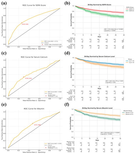 Prognostic value of SOFA score, serum calcium, and serum albumin levels for 30-day mortality prediction in critically ill bone metastasis patients. (a,c,e): ROC curves showing discrimination performance for SOFA score (a), serum calcium (c), and serum albumin (e), with AUCs reported and optimal thresholds determined by the Youden Index; (b,d,f): Kaplan–Meier survival curves comparing 30-day survival probabilities between stratified groups based on SOFA score ((b), <5 vs. ≥5), serum calcium ((d), <1.18 mmol/L vs. ≥1.18 mmol/L), and serum albumin ((f), <2.73 g/dL vs. ≥2.73 g/dL), with hazard ratios (HR) and log-rank p-values reported.